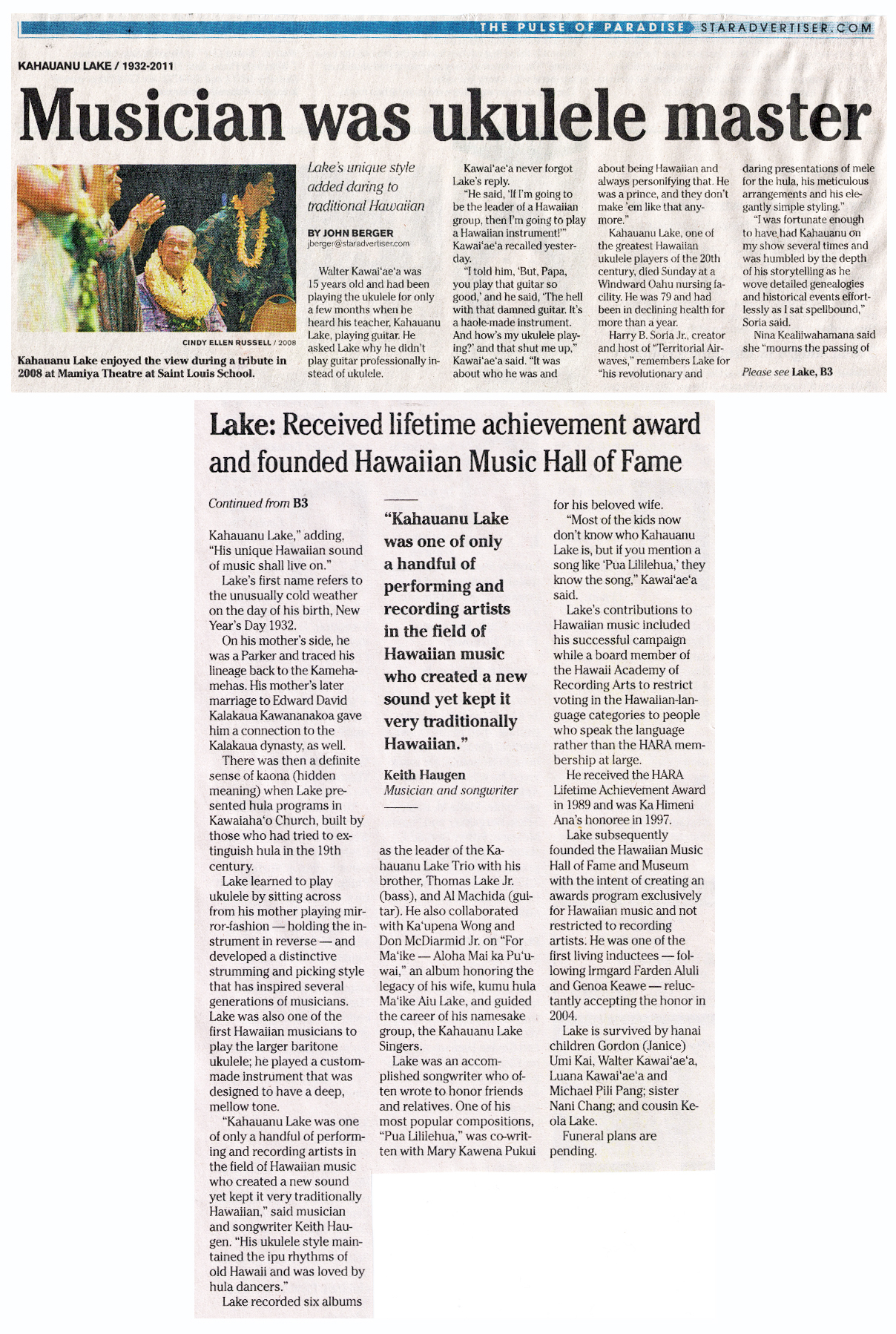 Kahauanu Lake, born in Wailuku Maui died on March 6, 2011 at the age of 79. He was a proud Hawaiian Scholar, Historian, Composer and Musician of unsurpassed talent.